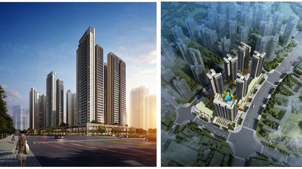 融湖三期建設項目東側(cè)為平吉大道,北側(cè)為朝陽路,南側(cè)為輔歧路,西側(cè)為朝富路,(輔歧路與朝富路均為規(guī)劃道路,目前尚未修建)。按照崗宏集團的發(fā)展戰(zhàn)略融湖三期項目實施計劃內(nèi)容披露:規(guī)劃用地26635平方米,總建筑面積約147812.79平方米。規(guī)劃興建5棟33層住宅樓與1棟33層保障房,均設置二層地下室,地下增建地下車庫和設備用房。配套建設一所12班規(guī)模的幼兒園及其他設施(公共廁所、物業(yè)服務用房、治安聯(lián)防站、架空公共空間)。預計2020年底竣工,估算投資40000萬元。規(guī)劃建成住宅集商業(yè)一體化的生活小區(qū)。設計效果圖如下: